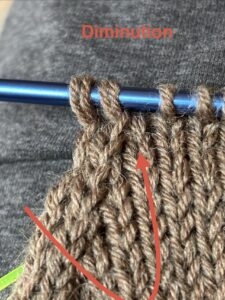 Puis j’ai tricoté la longueur du pied en jersey pour le coté de la plante du pied et en côtes 2/2 pour le dessus du pied. Enfin, à 4cm de la longueur totale devant être tricotée j’ai changé d’aiguilles circulaires afin de travailler en magic loop en maille jersey avec deux diminutions tous les deux rangs.